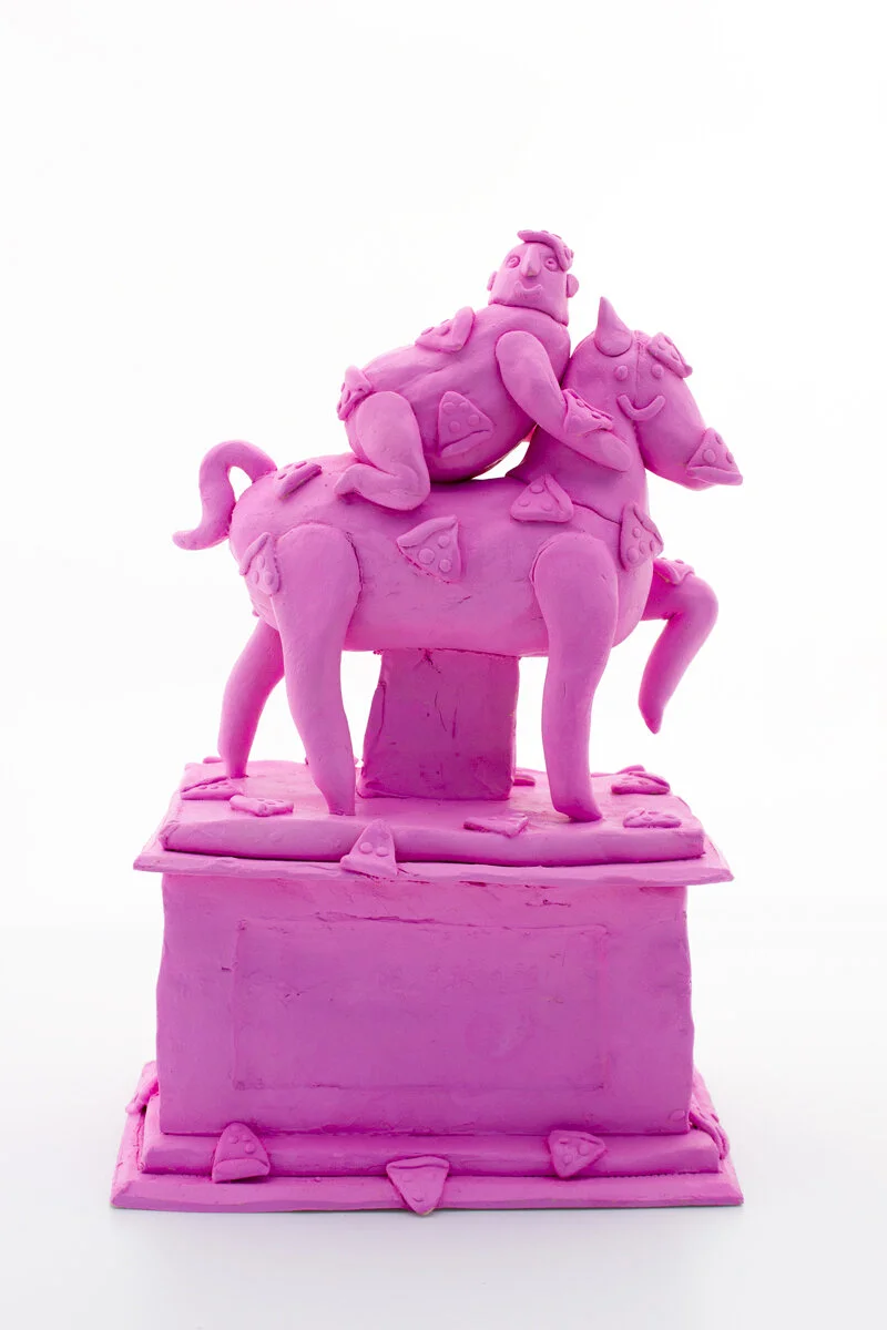 Pink Horsey, small ceramic sculpture with gouache paint, 23 x 14 x 9 cm. Available